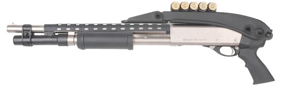 The Shotforce top-folding, tactical-style ambidextrous stock allows right or left handed shooters to operate in the open or closed position. The quick-release button allows the stock to lock in folded or unfolded positions. The stock is made of an extreme temperature, glass-reinforced polymer, is pre-drilled to accept a shell holder (not included), and includes a textured pistol grip. It also has a sling swivel stud and the mounting hardware and adapters are included. NOTE: This model fits most 12-gauge Maverick 88, Mossberg 500/535/590/835, Remington 870 and Winchester 1200/1300 shotguns.