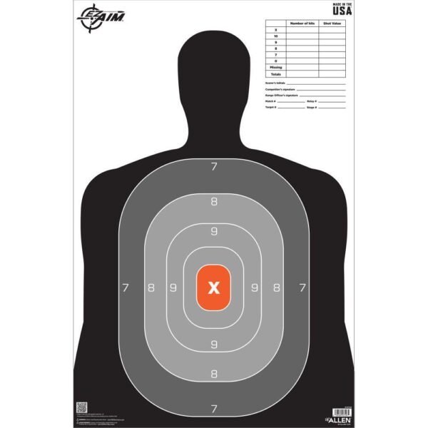 The EZ Aim B27 Pro Silhouette Paper Target designed for both dedicated shooters and those seeking to refine their shooting performance. Featuring an orange center of mass scoring section it provides an optimal aiming point for precise target acquisition. Each target measures 23 x 35 inches providing a generous surface area. With 50 targets included in each pack ensuring you have all you need for extended shooting sessions. Elevate your marksmanship with the EZ Aim B27 Pro Silhouette Paper committed to achieving excellence in their shooting practice.