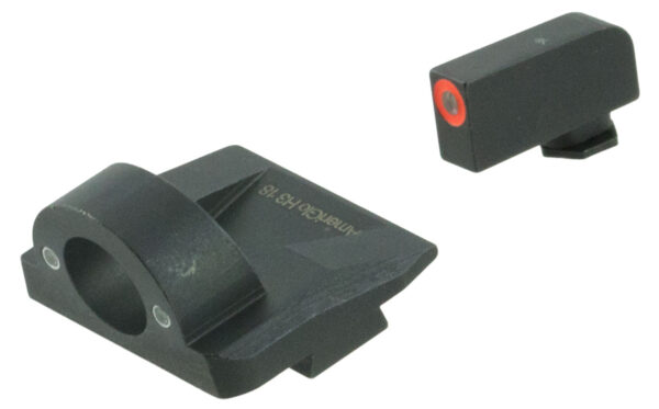 AmeriGlo brings a clear advantage to your shooting experience on and off the range. The Ghost Ring Sight is the preferred sight for shooters seeking an alternative to traditional post and notch sight design. It utilizes an aperture style rear sight with two tritium mini-dots and a bright tritium front sight providing quick front sight acquisition. This model has a green tritium with orange outline front sight, green tritium rear sight, and black finish. Does not fit Glock MOS slide.