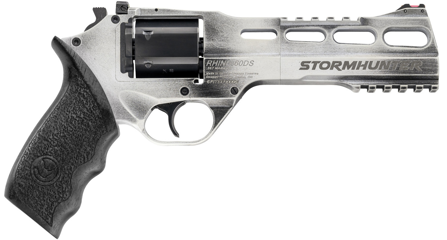 Menu Type: Handguns – Caliber: 357MAG – Action: Double – Barrel length: 6” – Capacity: 6 Rounds – Feed In: Manual – Trigger System: Single – Grips: Stippled Walnut Black – Rear Sight: Adj. Fiber Optic – Safety: Cylinder Block Cylinder Rotation Hammer Block – velocity: 1:19 Twist Rate – Total Length: 10.5” (266 mm) – Material: Machined 7075-T6 Alloy Frame Steel Cylinder & Barrel – Net Weight: 2.1 – Finishing: StormHunter – Extraction: Manual – Ships Loose: Manual + 3 Moon Clips – Note: Special Edition