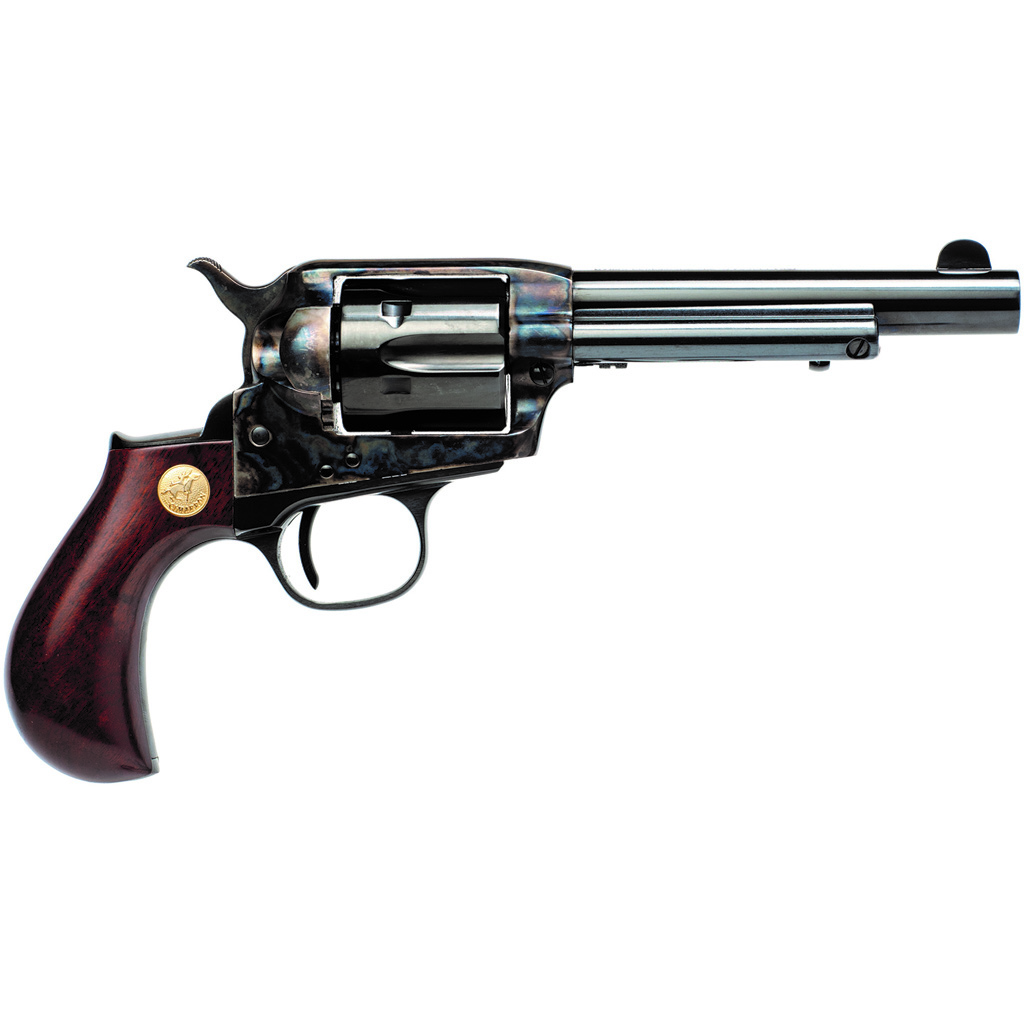 The Cimarron Lightning Revolver is a modern take on the classic Colt 1877 double-action design, featuring a case-hardened finish and a 4.75-inch barrel. This revolver is chambered in .38 Special (also includes a 9mm cylinder), offering reliable performance with its single-action mechanism. This firearm combines historical aesthetics with contemporary functionality, ideal for collectors and shooting enthusiasts alike.