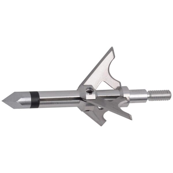 Mechanical broadhead with SBT blade retention system which allows it to be converted to a fixed blade head. Durable machined flex collar allows blades to deploy on impact when in mechanical setting. Features quality T-6 Aluminum ferrule and stainless steel trocar tip. Blade thickness: .032″, Cutting Diameter: 1″ (Fixed Blade), 1.5″ (Mechanical). Includes practice head.
