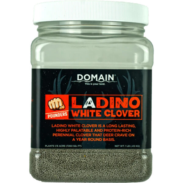Introducing the Domain Pounder Ladino Clover, an exceptional choice for landowners aiming to attract and nourish wildlife. This premium product offers 1 pound of Ladino white clover, renowned for its high palatability and protein-rich quality that deer and turkeys crave. With the ability to plant it alone or mix it into your preferred food plot blend, this clover is versatile and robust. Its expansive root system ensures excellent drought tolerance and longevity, stretching from the southern US to the northern regions. The Ladino white clover is a long-lasting perennial, capable of providing up to five years of lush forage with proper maintenance, making it a wise investment for year-round wildlife attraction.