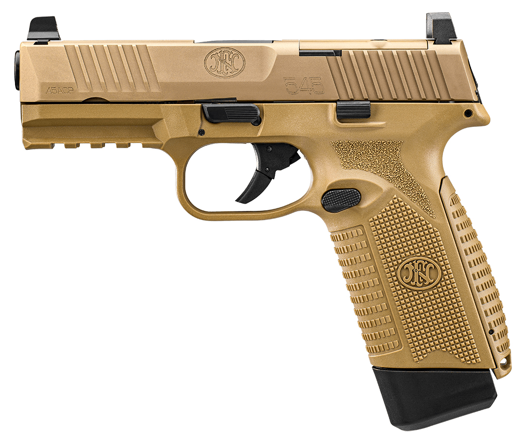 Upgraded ergonomics make the FN 545 MRD a pleasure to handle merging class-leading shootability with stopping power. Built with enduring accuracy in mind shooters can mount their favorite red dot sight in minutes adding pinpoint control on command. Complete with the high endurance striker and crisp 6-lb. trigger pull the FN 545 MRD is what other big bore pistols want to be when they grow up. – Specs – Caliber: .45 ACP – Operation: DOUBLE ACTION STRIKER-FIRED – Mag Capacity: 10 or 15 Rd. – Weight: 30 oz – Barrel Length: 4.1 – Overall Length: 7.7 – Twist Rate: 1:16 RH – Height: 6 – Width: 1.45 – Trigger Pull: 5.5-7.7 lbs – Sight Radius: 6.1 – Primary Features – 10+1 rounds of .45 ACP – Low-Profile Optics Mounting System – Precision-tuned trigger with clean break – Enhanced grip frame for unmatched control – Slide – Slide cut to mount most optics no gunsmith needed – Machined steel with front and rear cocking serrations loaded chamber indicator – Driftable steel sights co-witness with most MRD optics – High-endurance conical striker – Barrel – 4.1-inch cold hammer-forged target crowned for enduring accuracy – Polished feed ramp and chamber for feed reliability – Frame – Superior balance and grip texture dampen recoil and allow master control – Target-grade trigger breaks clean at approximately 6lbs – Interchangeable backstraps – MIL-STD-1913 rail – OPERATING CONTROLS – Fully ambidextrous slide stop lever and magazine release – MAGAZINE – Two 15-rd magazine or two 10-rd magazines – Low-friction follower; polymer base with nickel-coated steel body – SHIPS WITH – Two interchangeable backstraps – Two 15-round magazines or two 10-round magazines – Four MRD mounting plates – Owner’s manual – Locking device – Premium zippered case
