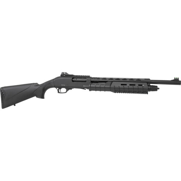 Fusion Liberty Basking Pump Action Shotgun 12 ga. 18.5 in. barrel with heat shield. Buck horn rear sight and Fiber optic front sight. 4 round tube magazine. All black barrel receiver and synthetic furniture. LOP 14.5 in. Choke tube set included.