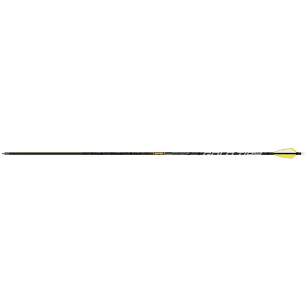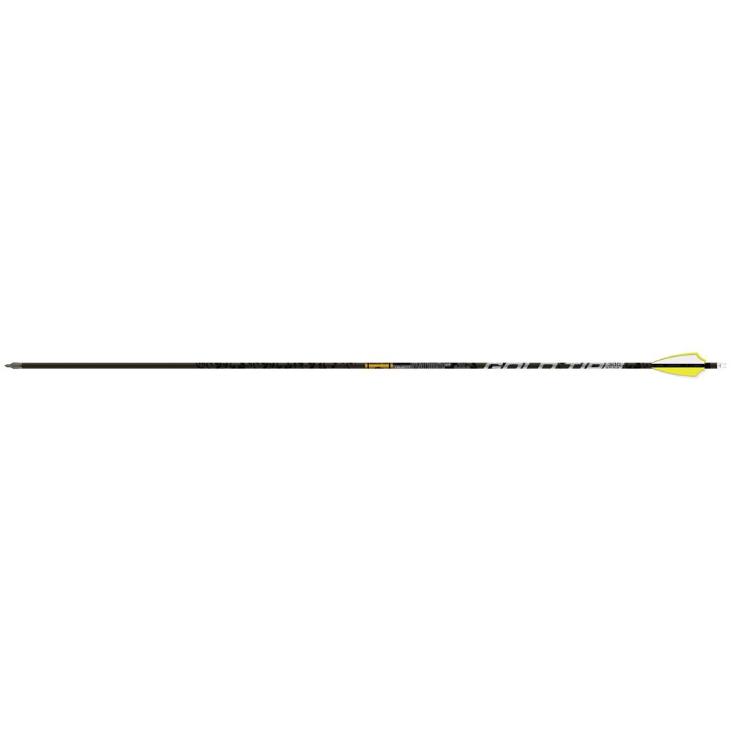 Features aggressive graphics with a lightweight carbon construction for increased speed. Straightness tolerance of +-.003″, Weight tolerance of +-2 gr. Available in sizes 300 (8.8 GPI), 340 (8.2 GPI), 400 (7.4 GPI), 500 (6.3 GPI), and 600 (5.9 GPI). Includes nocks and inserts. Factory four-fletched with 2.75″ low profile vanes for increased broadhead accuracy.