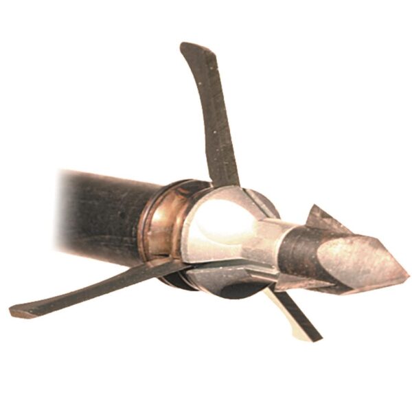 Three blade mechanical broadhead with aircraft-grade aluminum ferrule and .035″ thick blades. Features a chisel tip with mini blades for increased penetration. Includes practice head.