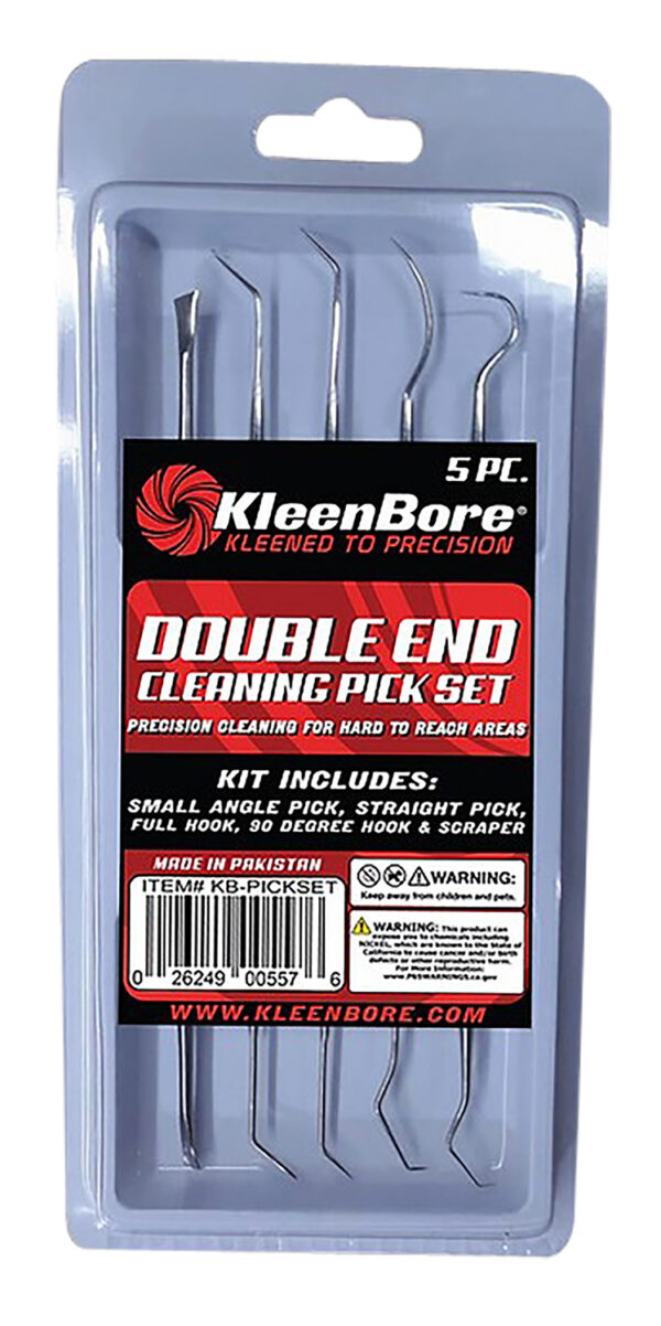The newest innovative line addition for KleenBore gun care is the Pick Set. This five piece Pick Set contains different shaped tools at each end to get into those tight, hard to clean/reach places. Each pick and hook is a finely crafted set of tools mad in the great American tradition. Won’t break or wear down like plastic tools and gives you better leverage and control for cleaning. Made with high quality stainless steel that is softer than barrel steel to ensure no damage to gun parts.