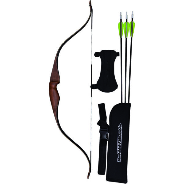 The Lil John Youth Recurve Set includes a 29″ bow with makore, maple and black fiberglass construction with a 10 pound draw weight at 16″ draw and includes three 26″ fiberglass arrows with 2.5″ vanes and metal glue-on bullet points. Belt quiver and belt, armguard and a padded bow case are also included. Recommended for ages 3 to 6.