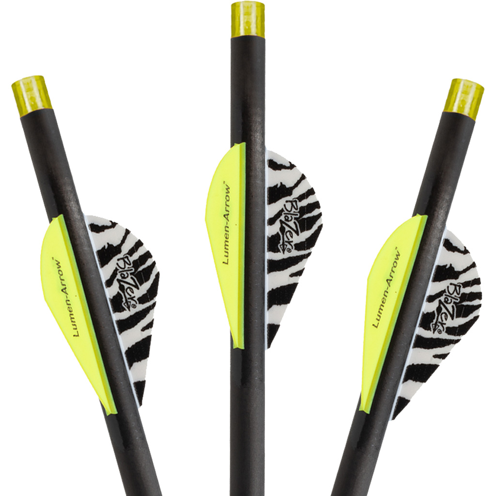 100 percent carbon crossbow bolt with Lumenok lighted nocks installed. Bolts are squared on the nock end to ensure proper functioning of the lighted nock. Factory fletched with 2″ Balzer vanes. Length: 20″. Includes brass inserts. Weight: 338 gr. (without point).