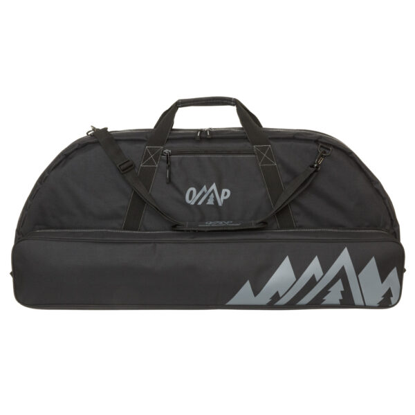 Full size compound bow case made from 600 denier material. Padded case has fleece interior, heavy-duty zippers, and shoulder strap. Features an exterior accessory pocket and arrow tube pocket. October Mountain logo and mountain design on front. Dimensions: 36”x17”.
