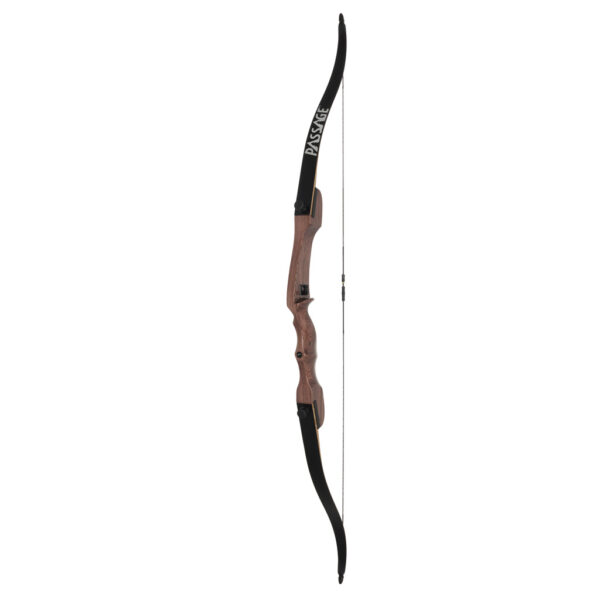 Ready-to-shoot recurve bow package. Three piece take down bow, ideal for young archers. Includes (1) of each of the following items: Passage take-down recurve, No-spill quiver, universal stringer, arm guard, Two-hole arrow rest, Quick-shot finger savers, and a nock set. The arrow rest, finger savers, and nock set are pre-installed. Comes equipped with sight, plunger, and stabilizer bushings. Riser is constructed of 100 percent purple heart wood.