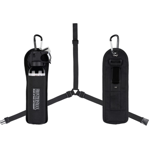 Offering security and safety, the Frontiersman Bear Spray has an effective range of up to 30 feet delivering 45 gram heavy fog burst per disposal containing 2.0% major capsaicinoids spray housed in a easy to locate, glow-in-the-dark container. Three-in-one chest holster included.