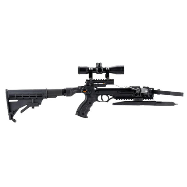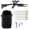 This crossbow is exceptionally lightweight, weighing only 2.5 lbs, thanks to its construction from a glass-infused polymer which provides durability without the bulk. It features a quick takedown design that breaks down into three parts for effortless transport and storage. The package is comprehensive, including a 150lb limb with foot stirrup, a 4x scope for precision aiming, six high-quality broadhead arrows for effective hunting, a tactical knife for utility, and a backpack for convenient carry.