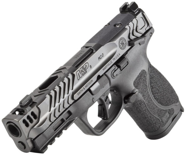 Continuing to pursue excellence in performance the new Performance Center M&P9 M2.0 Compact Carry Comp pistol focuses on enhancing the shooting experience. Strategically designed to leverage the gasses escaping the end of the gun during firing the Carry Comp helps reduce felt recoil meaning you can stay on target better all in a compact design. – CLEAR SIGHT CUT- Our unique design diverts gasses away from your optic letting you maintain an unobstructed view when firing. – FLAT-FACE TRIGGER- Our flat trigger design allows for consistent trigger finger placement giving you more accurate and repeatable shooting. – CARRY COMP®- Our strategically designed Power Port diverts gas upwards to reduce felt recoil when firing. – 4.22 1:10 twist stainless steel barrel w/Armornite® finish. – Optic ready. – Flat-face trigger with PC tuned action. – 18 degree grip angle. – Blacked-out serrated rear sight night sight front sight. – Stainless steel slide ported w/ gray Armornite® finish. – Four interchangeable palmswell grip inserts. – Ships with two 10-round magazines. – width 1.4 in – length 7.25 in – height 5 in – weight 25.4 oz – CALIBER 9MM – SIZE COMPACT – CAPACITY 10 – ACTION STRIKER FIRED – BARREL LENGTH 4.22 – GRIP POLYMER – SIGHTS NIGHT SIGHTS – OPTIC READY YES – SAFETY THUMB SAFETY – COLOR/FINISH BLACK – STATE COMPLIANCECO CT DE HI IL MD NJ NY RI VT WA DC – THREADED BARREL NO – BARREL MATERIAL STAINLESS STEEL – FRAME POLYMER – NUMBER OF MAGAZINES 2 – 10LB TRIGGER NO – MODEL M&P 2.0
