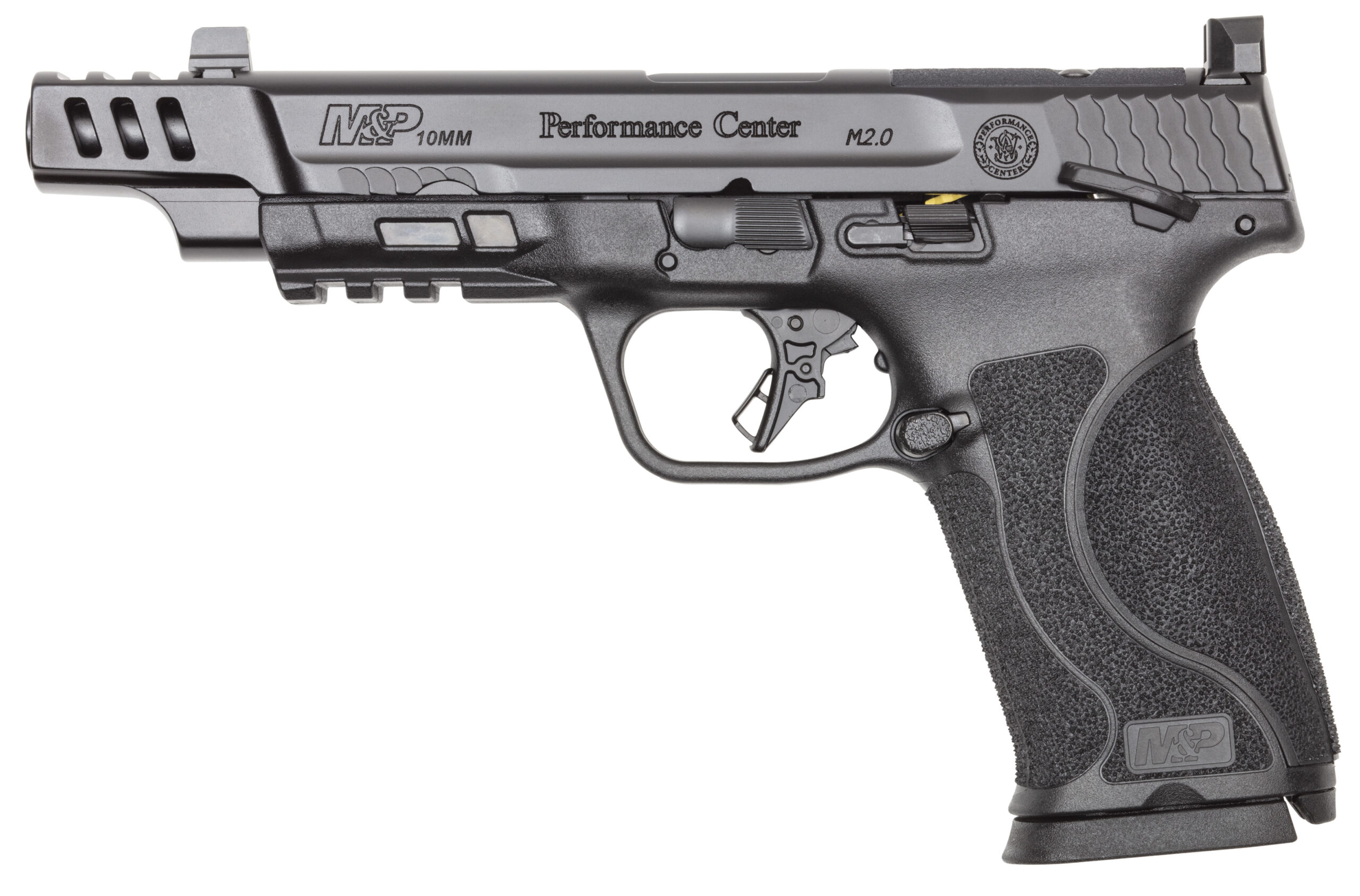 Building off of the successful launch of the M&P®10mm M2.0 we’re happy to give this the Performance Center® treatment. A long slide with porting in the barrel makes this a more accurate and more manageable 10mm handgun. The M2.0 flat trigger will give you consistency in your pull and now with the Performance Center® tuning you can deliver accurate shots down range. A perfect option for those looking to step up their game. – PORTED BARREL- The ported barrel reduces muzzle flip and perceived recoil allowing for quick follow-up shots. – PERFORMANCE CENTER® TRIGGER- The flat M2.0 trigger with the enhanced Performance Center® tuning gives you a crisp break and audible reset leading to more accurate and faster shooting. – TRITIUM NIGHT SIGHTS- Even in low light conditions you’ll be able to get a clear sight picture to remain accurate. – 5.6 1:10 twist stainless steel ported barrel w/Armornite® finish. – Optics-ready C.O.R.E. System. – Flat-face trigger. – 18 degree grip angle. – Optic height tritium night sights. – Manual thumb safety. – Stainless steel slide w/Armornite® finish. – Four interchangeable palmswell grip inserts. – Ships with two 10-round magazines. – width 1.3 in – length 8.6 in – height 5.6 in – weight 31.4 oz – NUMBER OF MAGAZINES 2 – CAPACITY 10 – SIGHTS OPTIC-HEIGHT TRITIUM NIGHT SIGHTS – GRIP POLYMER – OPTIC READY YES – SIZE FULL – SAFETY THUMB SAFETY – COLOR/FINISH BLACK – STATE COMPLIANCE CO CT DE HI IL MD NJ NY RI VT WA DC – CALIBER 10MM – BARREL LENGTH 5.6 – BARREL MATERIAL STAINLESS STEEL – ACTION STRIKER FIRED – FRAME POLYMER – MODEL M&P 2.0