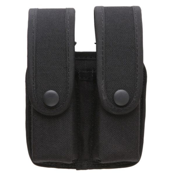 Uncle Mike’s Mirage Mag Case. Separate inserts can accommodate two double stack mag pouches for 9mm, 40 S&W, 10mm and 45ACP. Designed for 2.25″ duty belts and can be worn horizontally or vertically. Rigid inserts to retain shape