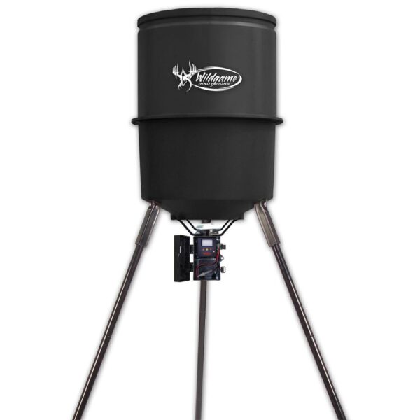 Free standing feeder with easy set up in approximately 15 minutes. Features a heavy duty leg kit, durable 30 gallon poly barrel with built in funnel, and digital power control unit with 4 feed times. Operates on 6V battery (not included).